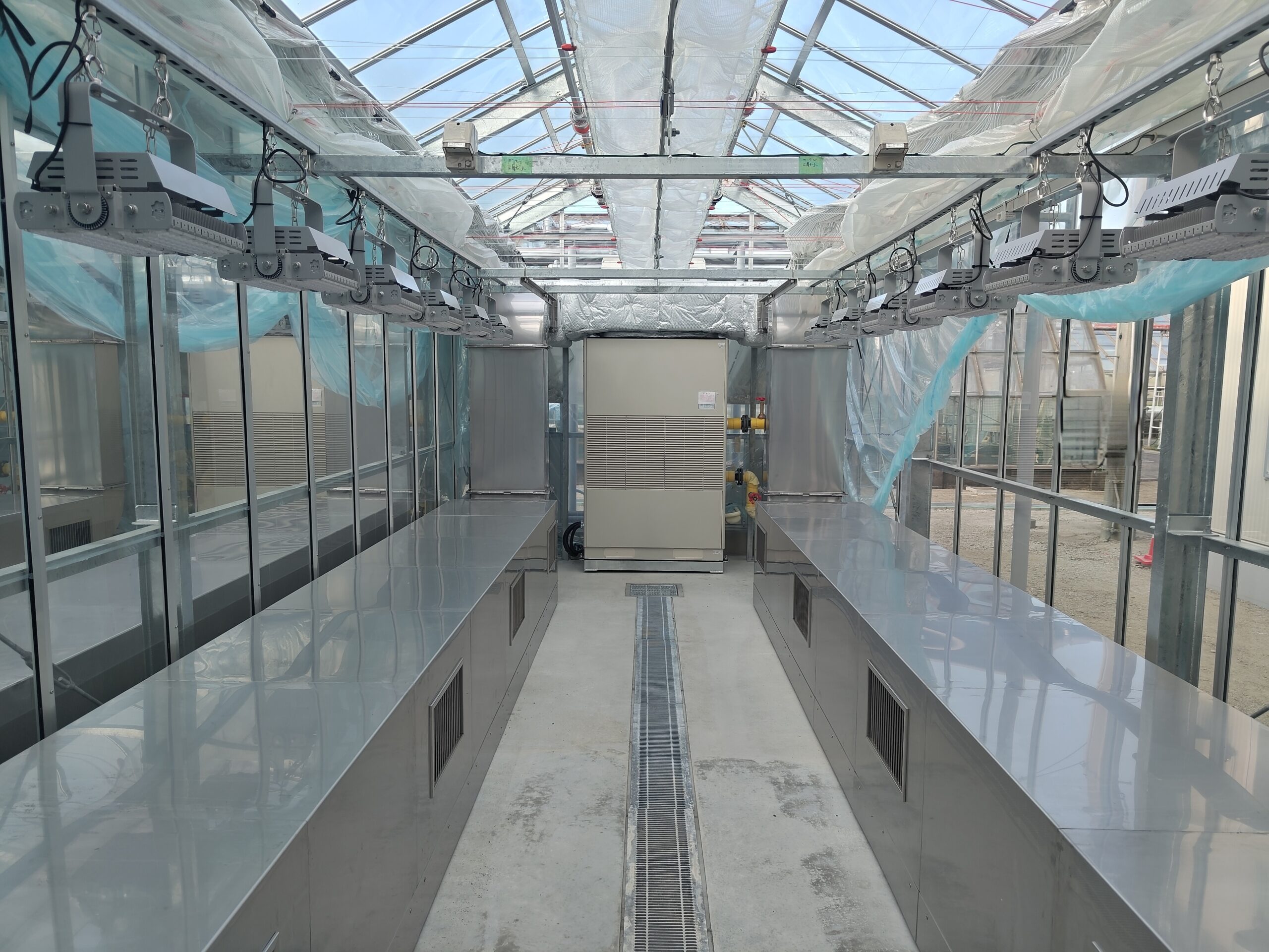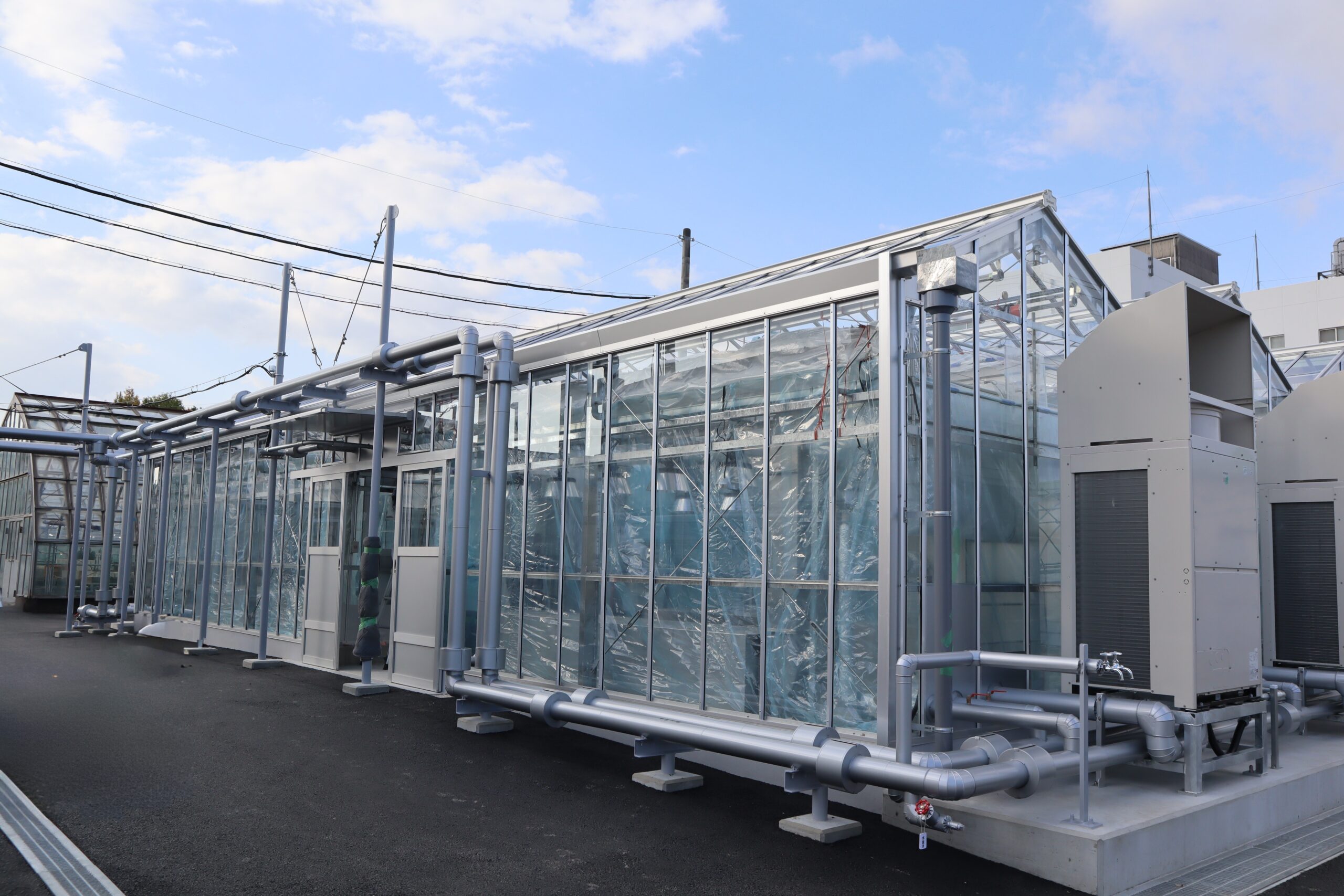 研究所内において重要な役割を担う3棟の電気設備工事を担当いたしました。 設計から施工まで一貫して対応し、温室など特殊用途建物ならではの環境条件を十分に考慮した設備を実現しております。 設計段階ではお客様のご要望を丁寧に反映し、施工においても安全性と機能性の両立を追求しました。 工事は残暑の厳しい時期に行われ、温室内の室温は40℃を超える過酷な環境となりましたが、作業員の健康と安全を最優先に熱中症対策を徹底し、無事故・無災害で竣工を迎えることができました。